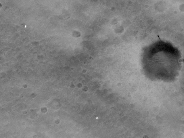 The history of Spirit's descent and landing on the surface of Mars is recorded in this image taken more than two weeks later on Jan. 19, 2004, by the camera on the orbiting Mars Global Surveyor. Spirit landed on Jan. 3, 2004. The two dots in the upper left are the spacecraft's backshell and parachute, which were shed as Spirit's bridle was cut, allowing the lander to bounce to a rest while safely encased in airbags. To the far right of the image, a dark streak above a large crater is believed to be the location where the heat shield impacted. The heat shield had protected the spacecraft during its descent through the martian atmosphere and was jettisoned several kilometers above the surface. A trail of bounce marks made by the airbags as Spirit bounced to a stop can be seen in the middle of the image. To the left of the second bounce mark is a square showing the location where engineers had calculated Spirit's airbags first hit the martian surface, based on data from the descent image motion estimation system located on the bottom of the rover's lander. The white dot near the bottom of the image is the lander, also known as the Columbia Memorial Station, at the Gusev Crater landing site. Beside it is a dot marked "surface feature location," showing the location of the lander estimated by the Spirit team using sight lines to landmarks in the lander's panoramic images. This image was taken in the early martian afternoon.