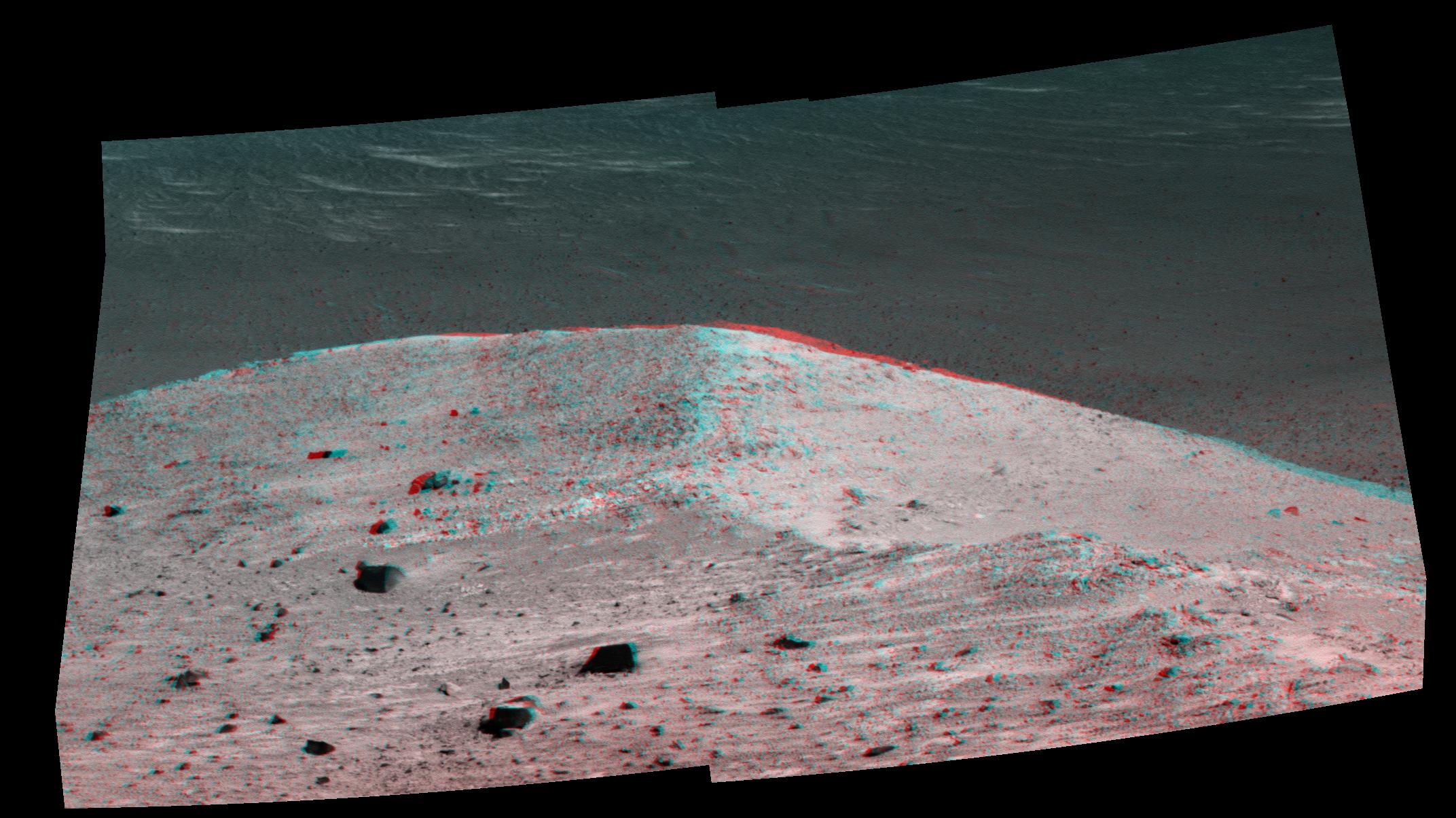 This stereo scene from NASA's Mars Exploration Rover Opportunity shows "Spirit Mound" overlooking the floor of Endeavour Crater. The mound stands near the eastern end of "Bitterroot Valley" on the western rim of the crater, and this view faces eastward.