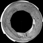 Where the receding tracks bend to the left, a circular pattern resulted from Spirit turning in place at a soil target informally named "Stapledon" after William Olaf Stapledon, a British philosopher and science-fiction author who lived from 1886 to 1950. Scientists on the rover team suspected that the soil in that area might have a high concentration of silica, resembling a high-silica soil patch discovered east of Home Plate in 2007. Bright material visible in the track furthest to the right was examined with Spirit's alpha partical X-ray spectrometer and found, indeed, to be rich in silica.