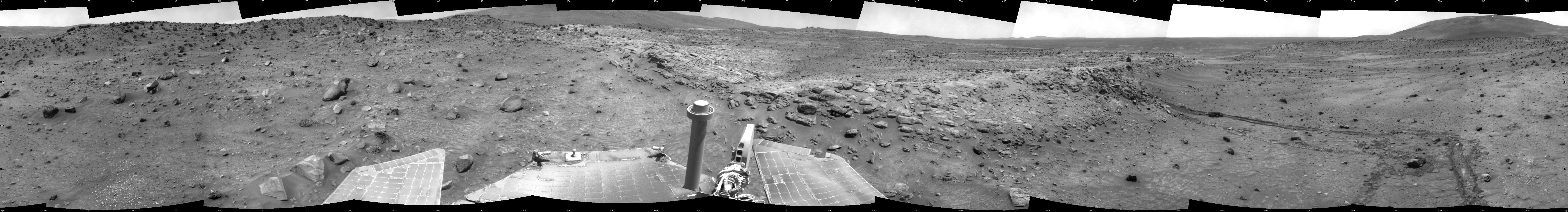 NASA Mars Exploration Rover Spirit used its navigation camera for the images assembled into this full-circle view of the rover's surroundings during the 1,802nd Martian day, or sol, (January 26, 2009) of Spirit's mission on the surface of Mars. South is at the center; north is at both ends.