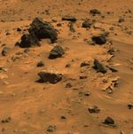 At least three different kinds of rocks await scientific analysis at the place where NASA's Mars Exploration Rover Spirit will likely spend several months of Martian winter. They are visible in this picture, which the panoramic camera on Spirit acquired during the rover's 809th sol, or Martian day, of exploring Mars (April 12, 2006). Paper-thin layers of light-toned, jagged-edged rocks protrude horizontally from beneath small sand drifts; a light gray rock with smooth, rounded edges sits atop the sand drifts; and several dark gray to black, angular rocks with vesicles (small holes) typical of hardened lava lie scattered across the sand.