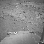 This image and one from Sol 1811 (February 5, 2009) (PIA11798) provide a before-and-after comparison of the dust visible on Spirit's rear solar array. The reduction in the dust coating is difficult to discern in the images. The cleaning event was detected by a change in electrical output from the solar panels.