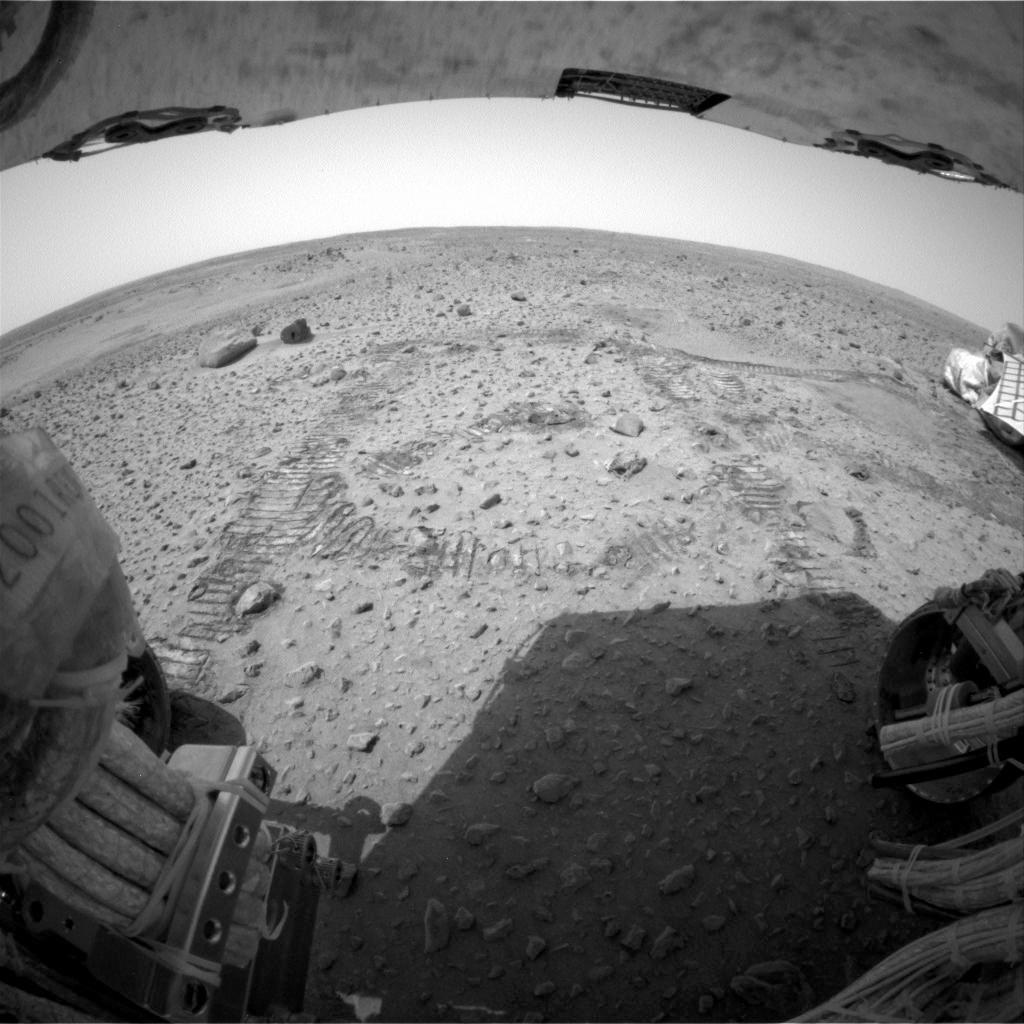 This rear hazard-identification camera image looks back at the circular tracks made in the martian soil when the Mars Exploration Rover Spirit drove about 3 meters (10 feet) toward the mountain-shaped rock called Adirondack, Spirit's first rock target. Spirit made a series of arcing turns totaling approximately 1 meter (3 feet). It then turned in place and made a series of short, straightforward movements totaling approximately 2 meters (6.5 feet). The drive took about 30 minutes to complete, including time stopped to take images. The two rocks in the upper left corner of the image are called "Sashimi" and "Sushi." In the upper right corner is a portion of the lander, now known as the Columbia Memorial Station.