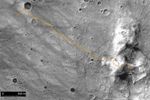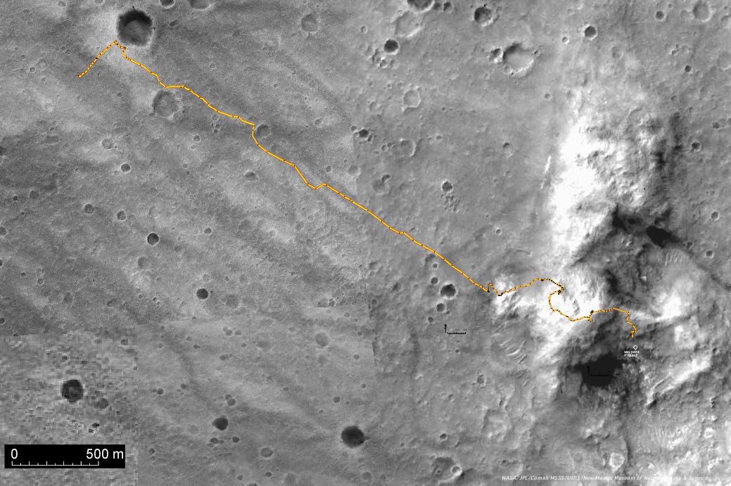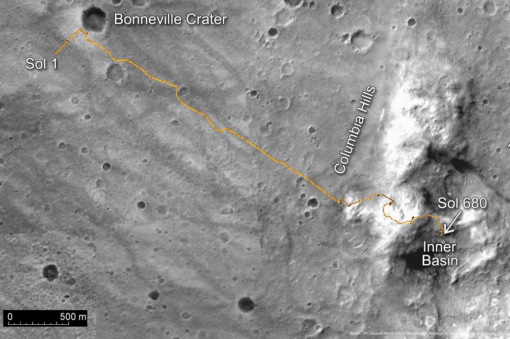 This image shows the route that NASA's Mars Exploration Rover Spirit has driven inside Gusev Crater from its first Martian day (sol 1) to its 680th sol (Dec. 1, 2005), more than a complete Martian year. The underlying image (previously released as PIA07849) is a mosaic of images from the Mars Orbiter Camera on NASA's Mars Global Surveyor orbiter. The scale bar at lower left is 500 meters (0.31 mile). As of sol 680, Spirit had driven a total of 5,495 meters (3.41 miles).
