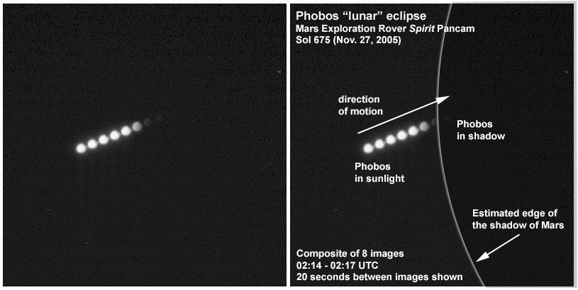 NASA's Mars Exploration Rover Spirit observed the Martian moon Phobos entering the shadow of Mars during the night of the rover's 675th sol (Nov. 27, 2005). The panoramic camera captured 16 images, spaced 10 seconds apart, covering the period from when Phobos was in full sunlight to when it was entirely in shadow. As with our own Moon during lunar eclipses on Earth, even when in the planet's shadow, Phobos was not entirely dark. The small amount of light still visible from Phobos is a kind of "Mars-shine" -- sunlight reflected through Mars' atmosphere and into the shadowed region.