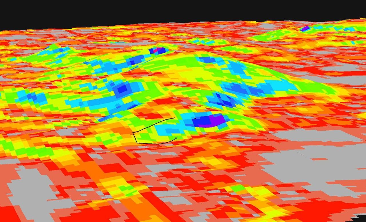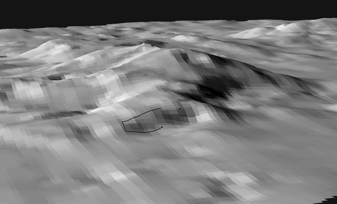 In figure 2, the map shows the north-facing slopes of the "Columbia Hills," just in front of the Mars Exploration Rover Spirit's current position. Bright areas indicate surfaces sloping more toward the north than dark areas. To reach the rock outcrop at the top of the hill, engineers will aim to drive the rover around the dark areas, which would yield less solar power. The curved black line in the middle represents the rover's planned traverse path.