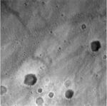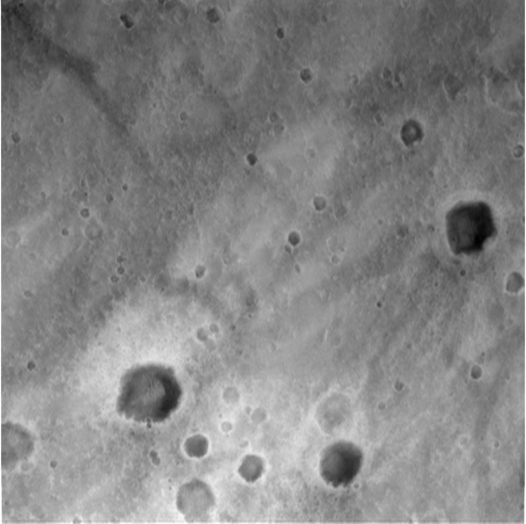 This image, taken by the descent image motion estimation system camera located on the bottom of the Mars Exploration Rover Spirit's lander, shows a view of Gusev Crater as the lander descends to Mars. The picture is taken at an altitude of 1983 meters. Numerous small impact craters can be seen on the surface of the planet. These images help the onboard software to minimize the lander's horizontal velocity before its bridal is cut, and it falls freely to the surface of Mars.