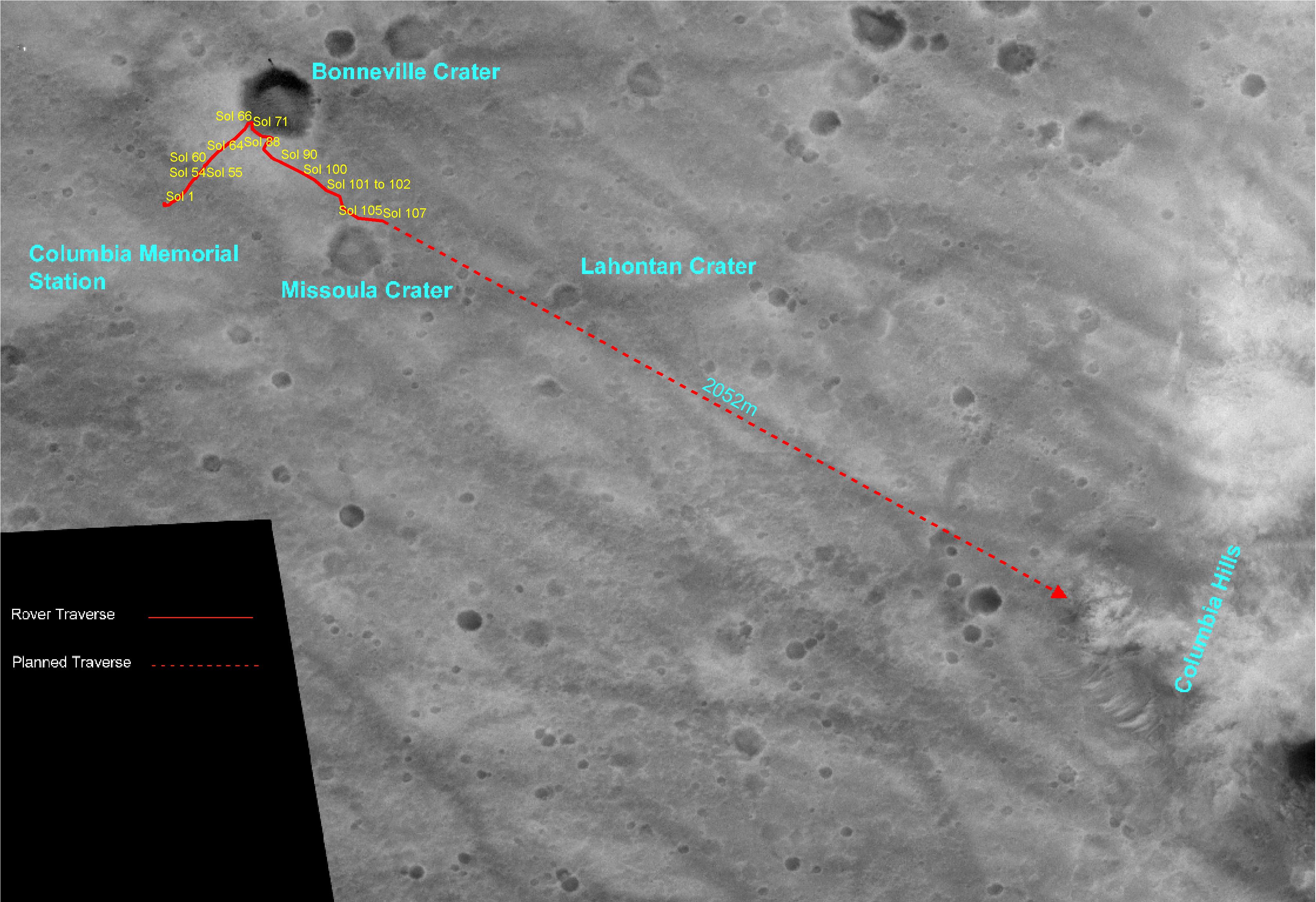 This overview map made from Mars Orbiter camera images illustrates the path that the Mars Exploration Rover Spirit has taken from its first sol on the red planet through its 107th sol. As of sol 112 (April 26, 2004), Spirit has passed "Missoula" crater and sits approximately 1,900 meters (1.18 miles) away from its destination at the western base of the "Columbia Hills." While most of Spirit's journey has been over the very angular rocks that make up the ejecta fields surrounding "Bonneville" crater, the rover's next 50 or so sols will be spent traversing over martian plains that are dominated by rounder, vesicle-filled rocks.