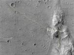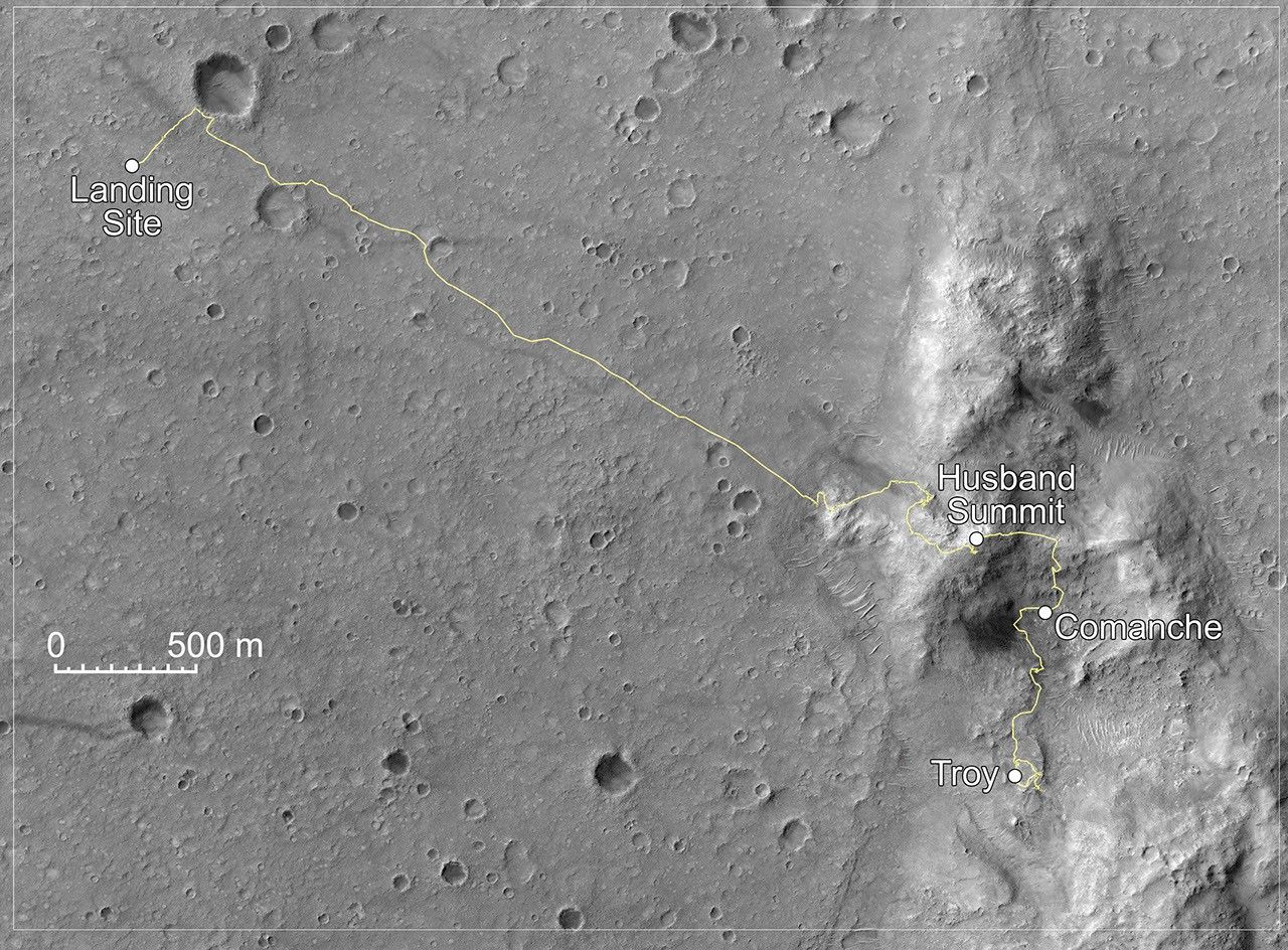 For this map, the yellow line indicating Spirit's route has been overlaid onto a portion of an image taken by the High Resolution Imaging Science Experiment on NASA's Mars Reconnaissance Orbiter on Nov. 22, 2006, That image is catalogued as PSP_001513_1655 (see also PIA01897). The scale bar on the map is 500 meters (1,640 feet) long. North is up.