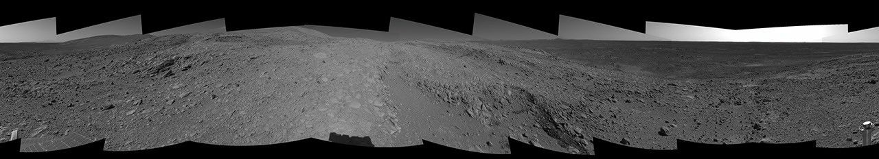 NASA's Mars Exploration Rover Spirit looked up at the "Columbia Hills" from its location on the 265th martian day, or sol, of its mission (Sept. 30, 2004) and captured this 3-D view. This cropped mosaic image, presented here in a cylindrical-perspective projection with geometric seam correction, was taken by the rover's navigation camera.