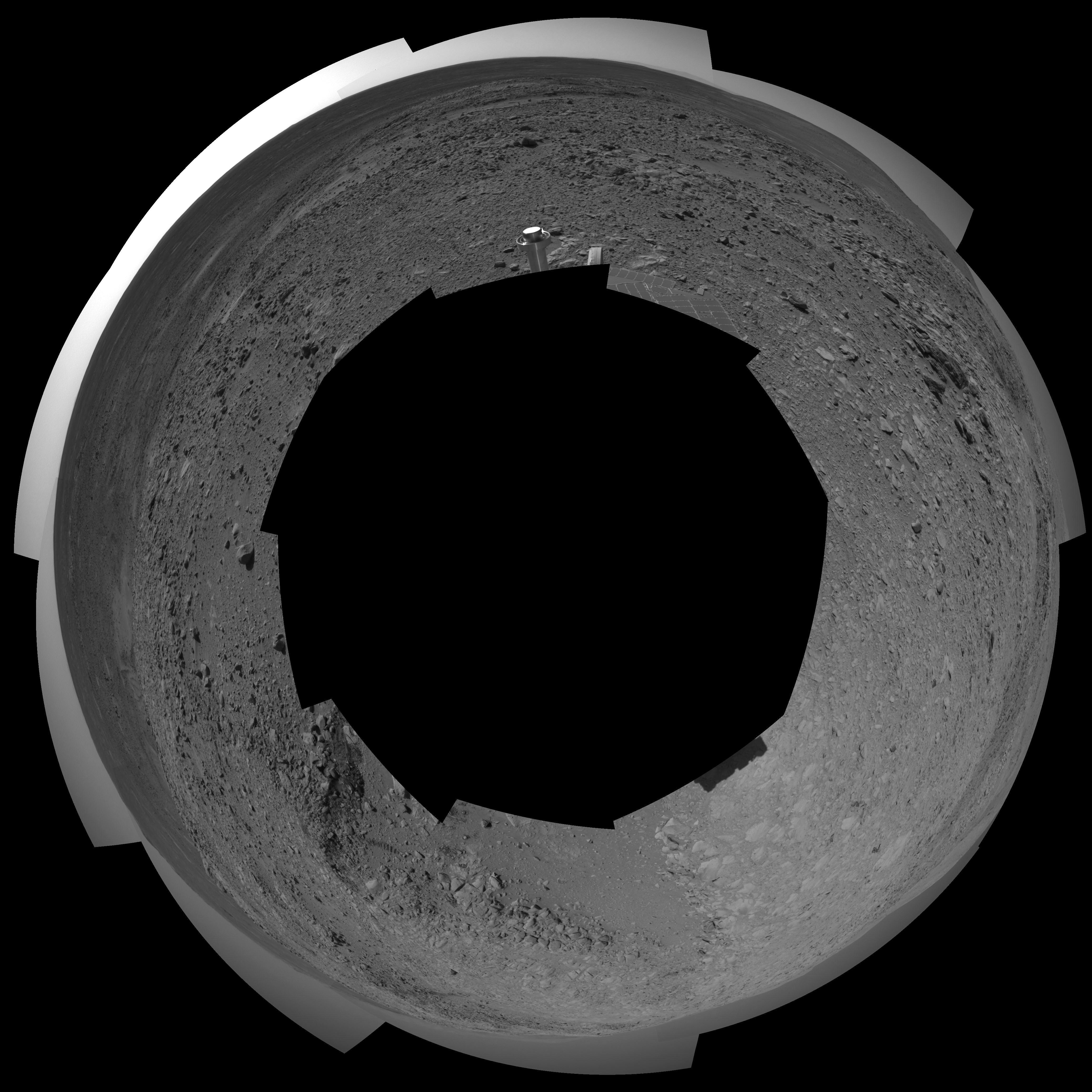 NASA's Mars Exploration Rover Spirit looked up at the "Columbia Hills" from its location on the 265th martian day, or sol, of its mission (Sept. 30, 2004) and captured this view. This cropped mosaic image, presented here in a polar projection with geometric seam correction, was taken by the rover's navigation camera.