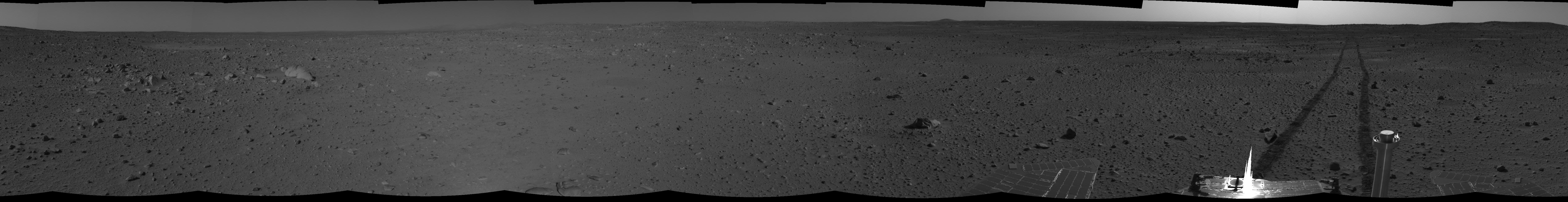 This cylindrical-projection mosaic was created from navigation camera images that NASA's Mars Exploration Rover Spirit acquired on sol 101 (April 15, 2004). It reveals Spirit's view just before a stopping-point dubbed "Missoula Crater." The rover is on its way to the "Columbia Hills."