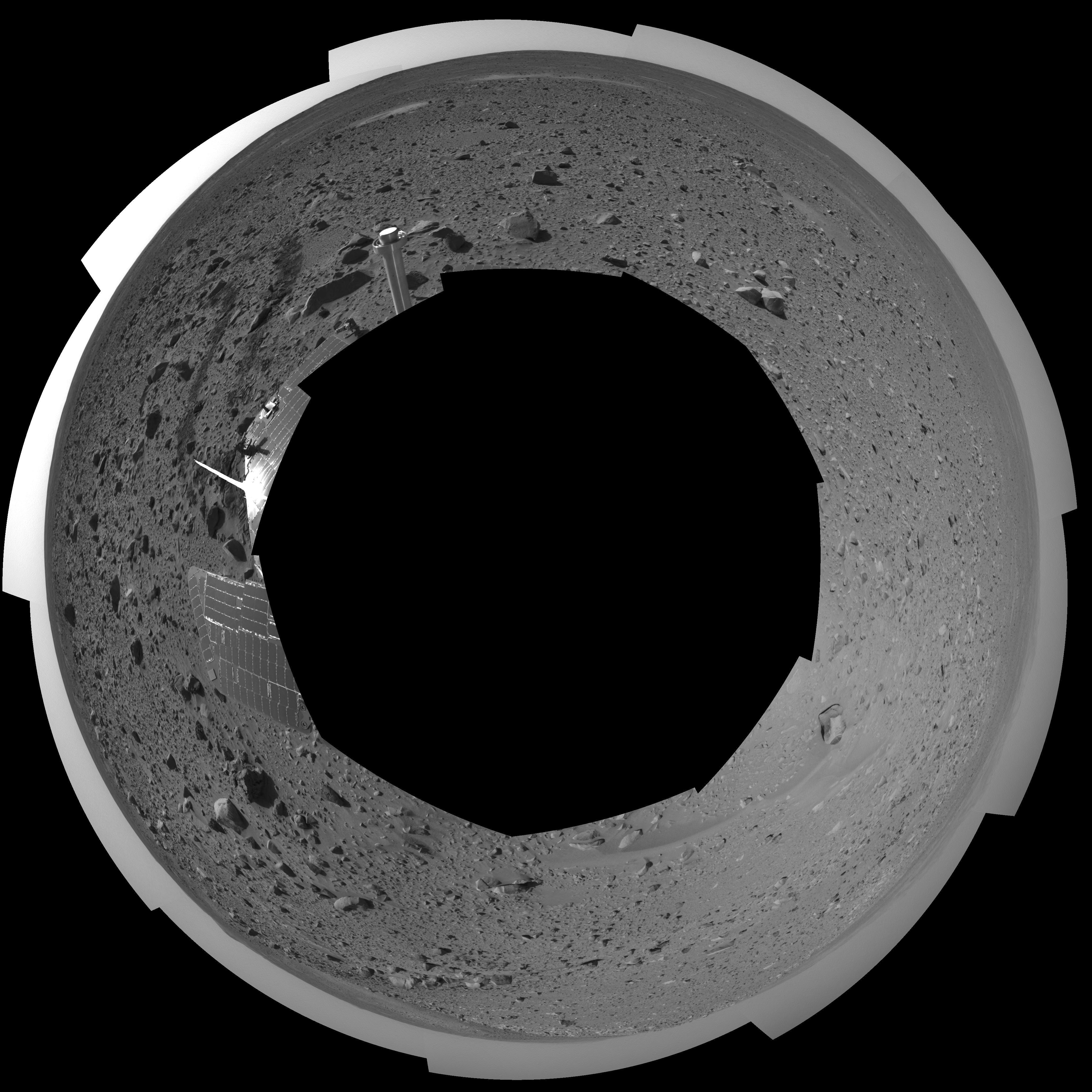 This polar projection was assembled from images taken by the navigation camera on the Mars Exploration Rover Spirit on sol 107 (April 21, 2004) at a region dubbed "site 32." Spirit is sitting east of "Missoula Crater," no longer in the crater's ejecta field, but on outer plains. Since landing, Spirit has traveled almost exclusively over ejecta fields. This new landscape looks different with fewer angular rocks and more rounded, vesicle-filled rocks. Spirit will continue another 1,900 meters (1.18 miles) along this terrain before reaching the western base of the "Columbia Hills."