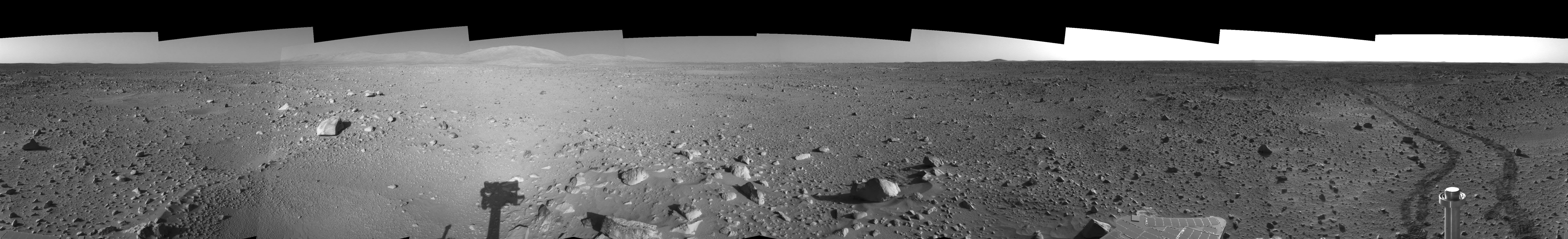 This is the right-eye view of a stereo pair showing a 360-degree view of the terrain surrounding NASA's Mars Exploration Rover Spirit on the 142nd martian day of the rover's mission inside Gusev Crater, on May 27, 2004. It was assembled from images taken by Spirit's navigation camera. The rover's position is Site A55. The view is presented in a cylindrical-perspective projection with geometrical seam correction.