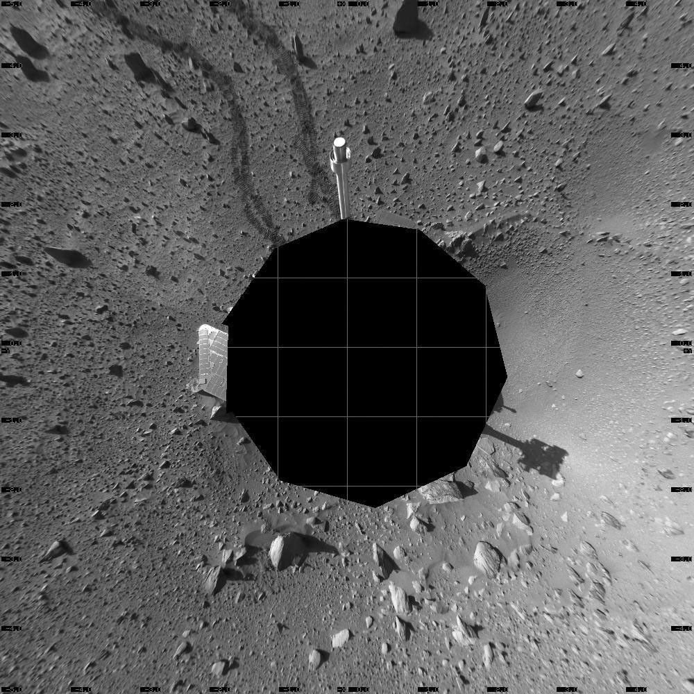 This 360-degree view of the terrain surrounding NASA's Mars Exploration Rover Spirit on the 142nd martian day of the rover's mission inside Gusev Crater, on May 27, 2004, was assembled from images taken by Spirit's navigation camera. The rover's position is Site A55. The view is presented in a vertical projection with geometrical seam correction.