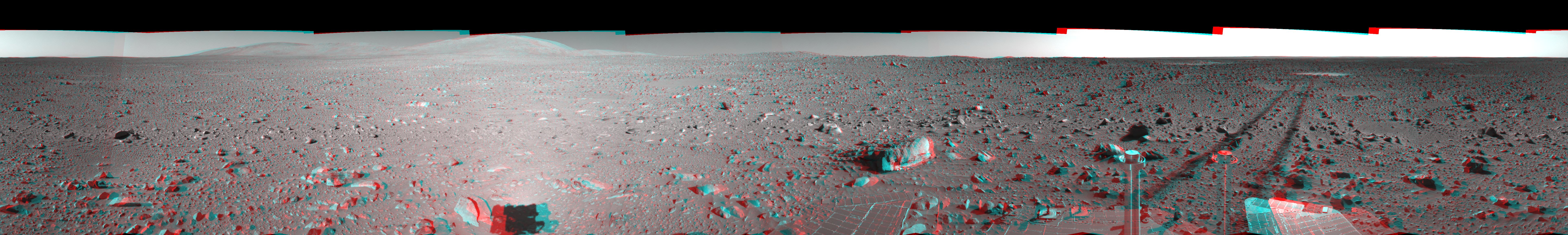 This 360-degree stereo anaglyph of the terrain surrounding NASA's Mars Exploration Rover Spirit on the 148th martian day of the rover's mission inside Gusev Crater, on June 2, 2004, was assembled from images taken by Spirit's navigation camera. The rover's position is Site A61. The view is presented in a cylindrical-perspective projection with geometrical seam correction.