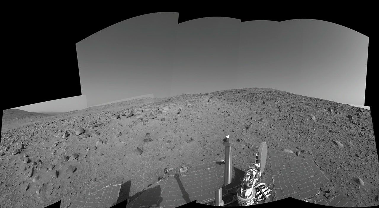 NASA's Mars Exploration Rover Spirit used its navigation camera to capture this view during the rover's 390th martian day, or sol, (Feb. 6, 2005). The rover advanced about 13 meters (43 feet) driving backwards uphill on that sol. The view is uphill toward "Cumberland Ridge" on "Husband Hill." It is presented in a cylindrical projection with geometric seam correction.