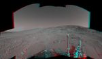 An attempted drive NASA's Mars Exploration Rover Spirit on Feb. 15, 2005 did not gain any ground toward nearby 'Larry's Lookout' because of slippage that churned the soil on the slope. 3D glasses are necessary to view this image.
