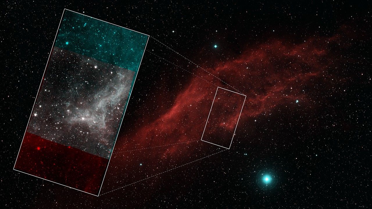 The image displays Spitzer's observations much the way that research astronomers would view them: From 2009 to 2020, Spitzer operated two detectors simultaneously that imaged adjacent areas of the sky. The detectors captured different wavelengths of infrared light (referred to by their physical wavelength): 3.6 micrometers (shown in cyan) and 4.5 micrometers (shown in red). Different wavelengths of light can reveal different objects or features. Spitzer would scan the sky, taking multiple pictures in a grid pattern, so that both detectors would image the region at the center of the grid. By combining those images into a mosaic, it was possible to see what a given region looked like in multiple wavelengths, such as in the gray-hued part of the image above.