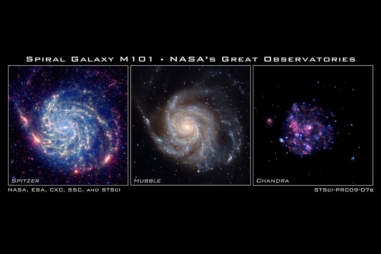 The galaxy Messier 101 is a swirling spiral of stars, gas, and dust. Messier 101 is nearly twice as wide as our Milky Way galaxy. Spitzer's view, taken in infrared light, reveals the galaxy's delicate dust lanes as yellow-green filaments. Such dense dust clouds are where new stars can form. In this image, dust warmed by the light of hot, young stars glows red. The rest of the galaxy's hundreds of billions of stars are less prominent and form a blue haze. Astronomers can use infrared light to examine the dust clouds where stars are born.