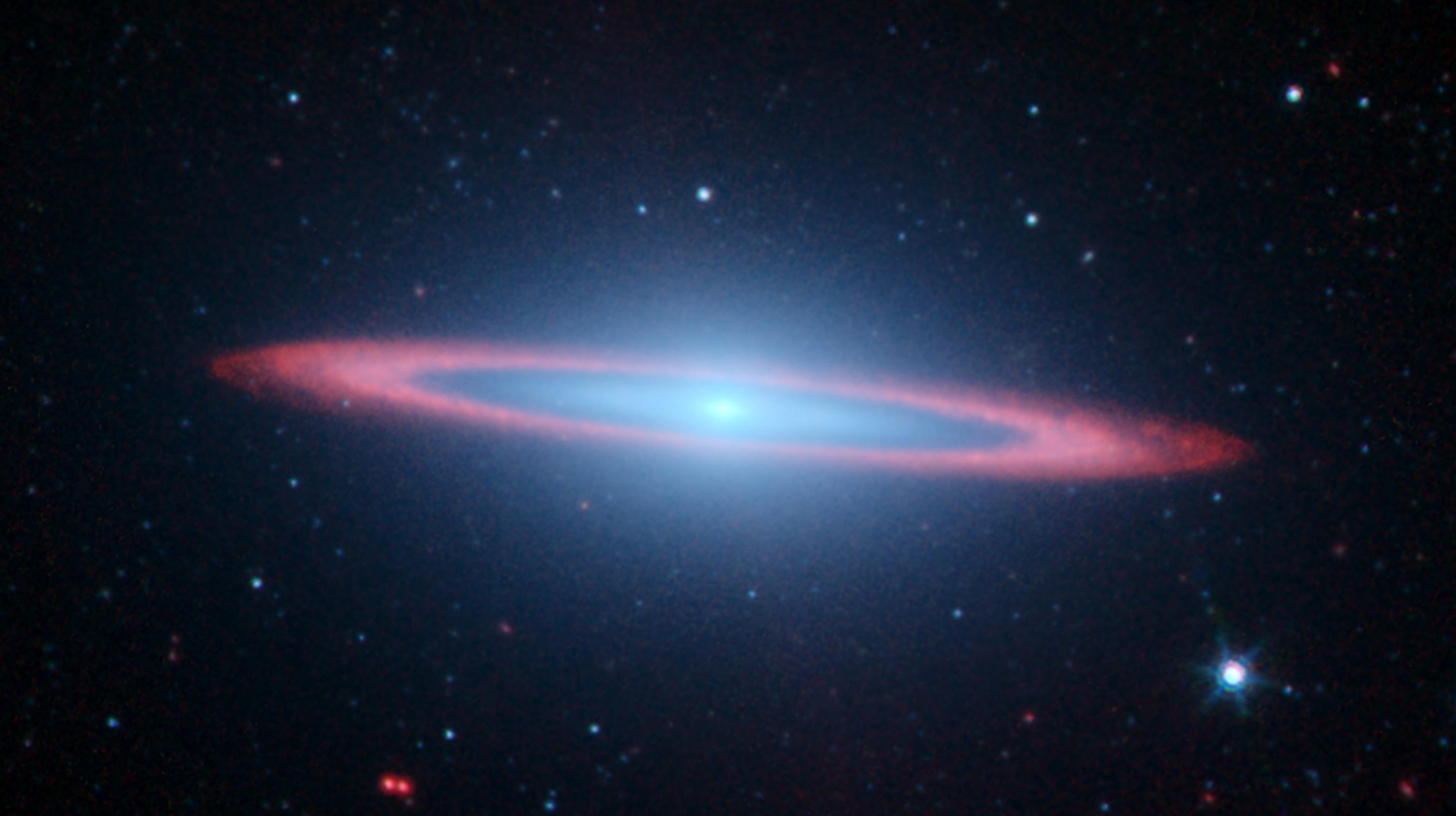 Recent observations using Spitzer's infrared array camera uncovered the bright, smooth ring of dust circling the galaxy, seen in red. In visible light, because this galaxy is seen nearly edge-on, only the near rim of dust can be clearly seen in silhouette. Spitzer's full view shows the disk is warped, which is often the result of a gravitational encounter with another galaxy, and clumpy areas spotted in the far edges of the ring indicate young star-forming regions.
