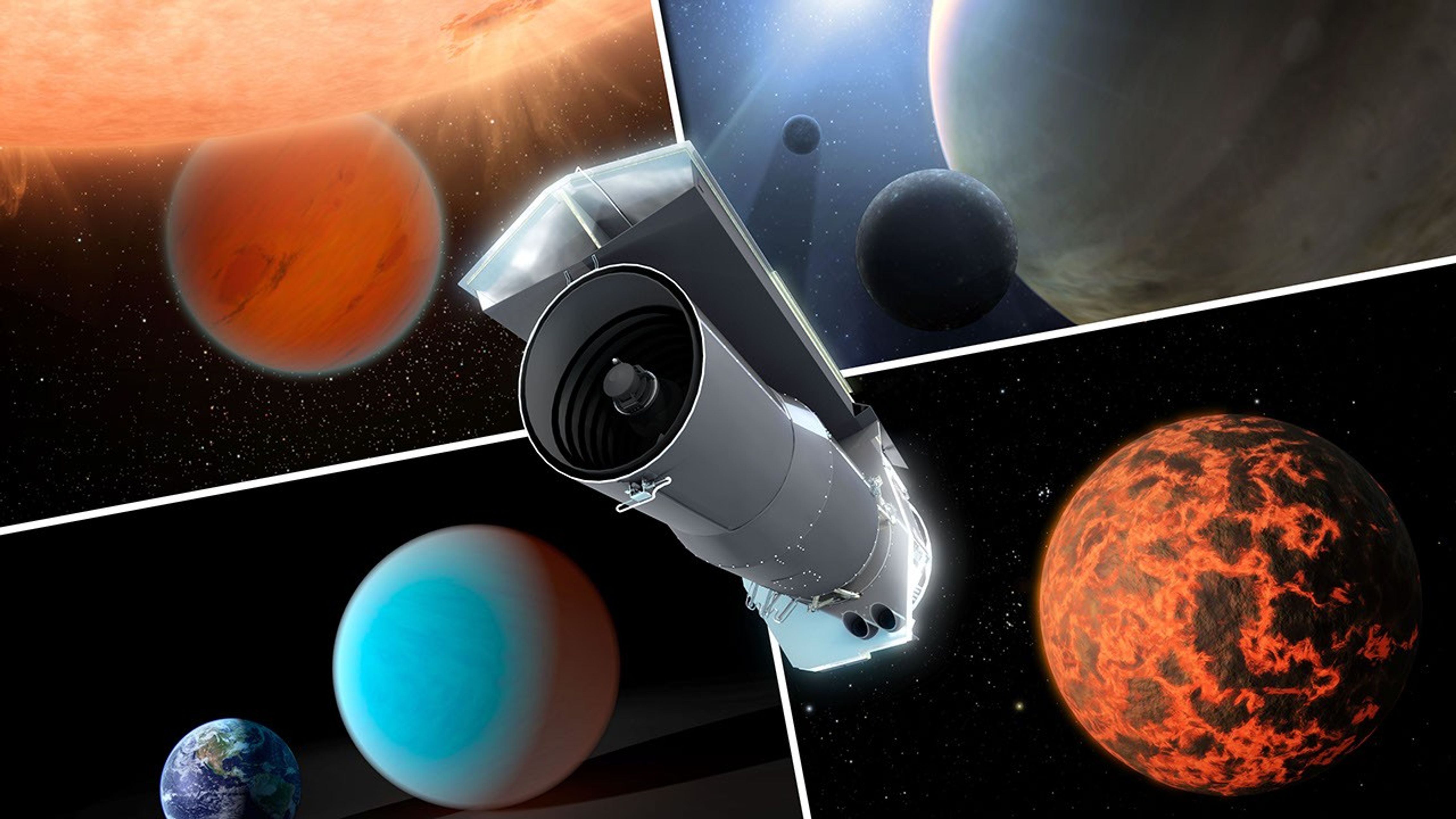 This artist's concept shows Spitzer surrounded by examples of exoplanets the telescope has examined.