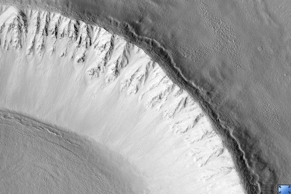 This image's cutout (approximately 800 x 250 m, or 875 x 275 yards) shows a portion of the west-facing slope inside the crater; upslope is to the right (east). In this subimage, east-west channels, some of them 6 m (6.5 yards) wide, cut into the slope's soils.