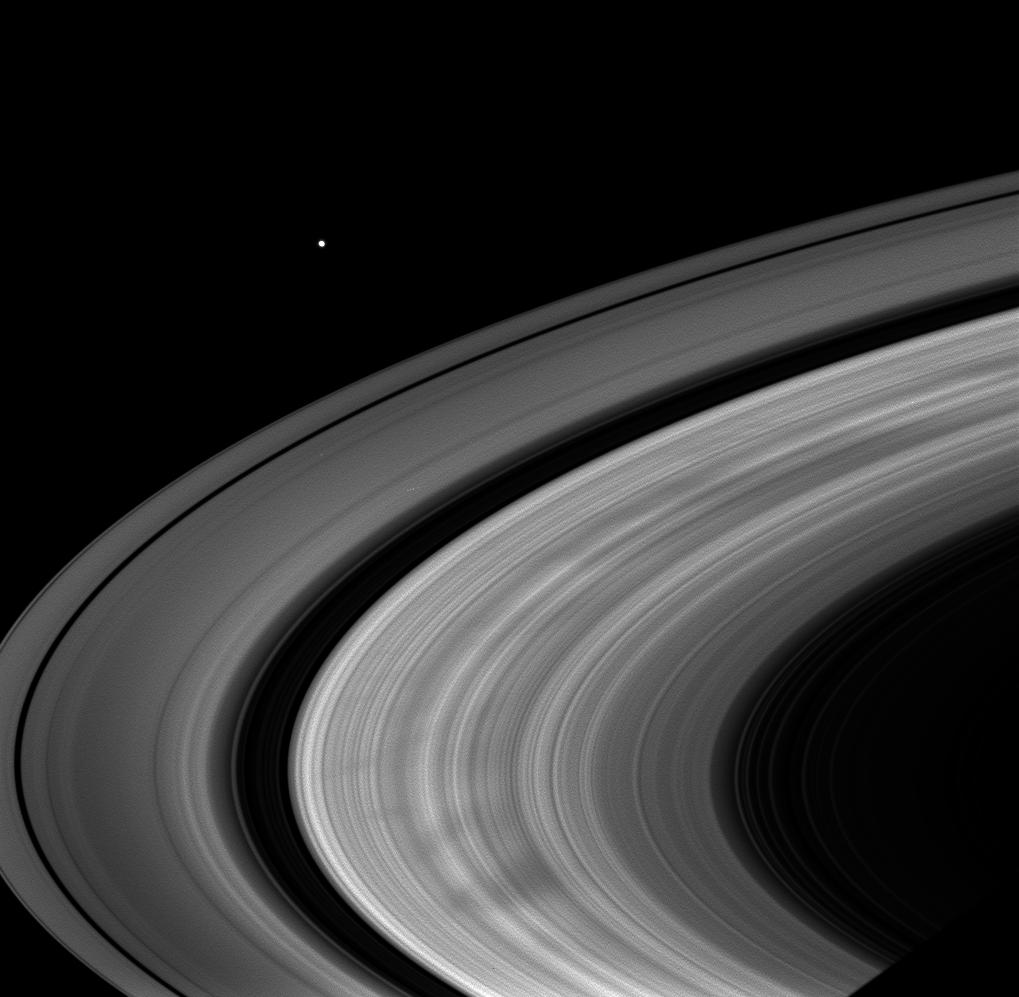 The image was taken in visible light with the Cassini spacecraft wide-angle camera on Oct. 19, 2008 at a distance of approximately 1.011 million kilometers (628,000 miles) from Saturn and at a Sun-Saturn-spacecraft, or phase, angle of 29 degrees. Image scale is 57 kilometers (35 miles) per pixel.