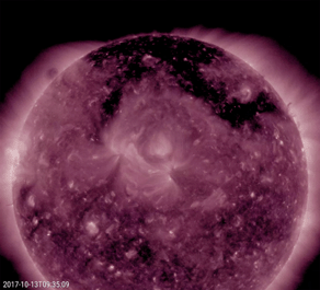 A large coronal hole stands out as the most obvious feature on the sun this week (Oct. 12-13, 2017). The dark structure, shaped kind of like the Pi symbol, spreads across much of the top of the sun. Though one cannot tell from this image and video clip in false-color extreme ultraviolet light, it is spewing high-speed solar wind particles into space and has been doing this all week. It is likely that these charged particles have been interacting with Earth's atmosphere and generating many aurora displays in regions near the poles the past several days.