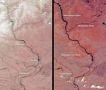 Each image in this pair covers an identical 195-kilometer x 339-kilometer area. The one on the left was acquired March 26, 2001 (Terra orbit 6762), and the one on the right is from April 27 (Terra orbit 7228). Both are false-color composites, displaying data from the near-infrared band of the instrument's nadir (vertical-viewing) camera as red; the green band of the nadir camera as green; and the red band of the 26-degree forward camera as blue. Data from the forward-viewing camera is included to enhance the reflectivity of water. The near-infrared data provide a good indicator of the abundance of vegetation since plants are highly reflective in this spectral region. The redder color of the right-hand image is due to increased vegetation cover brought about by wet conditions and the onset of spring.