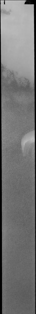 Today's VIS image is located over Olympia Undae, the largest of several dune fields that surround the north polar cap. The dunes look like salt and pepper against a bright background. The spring arrival of the sun has begun the defrosting process, and most of the dunes are still covered in frost. As the season progresses the dunes will appear darker and darker as the dark sand is revealed from under the bright frost cover.