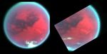 Evidence of changing weather patterns in the skies over Titan's southern region are revealed in these false color images obtained by the Cassini spacecraft's visual infrared mapping spectrometer over two recent flybys of this largest of Saturn's satellites. In the first image (left), obtained on the Oct, 26, 2004 Titan flyby, from a distance of some 200,000 kilometers (124,300 miles), Titan's skies are cloud-free, except for a patch of clouds observed over the south pole near the bottom of the image. In contrast, the image on the right shows a recent view of this same area of Titan obtained seven weeks later on the second close Titan flyby on Dec. 13, 2004, from a distance of 225,000 kilometers (139,800 miles). This image clearly shows that several extensive patches of clouds have formed over temperate latitudes. The appearance of these clouds reveals the existence of weather. Tracking these features is currently underway by scientists, who hope to gain a better understanding of global circulation, regional weather patterns, and localized meteorology in Titan's skies.