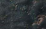 This image shows sand dunes mixed with rock outcrops on the floor of a large crater. Some of the dunes have squiggly crests, which is unusual. It looks like this is due to the outcrops, which anchor the dune in places as they migrate.