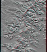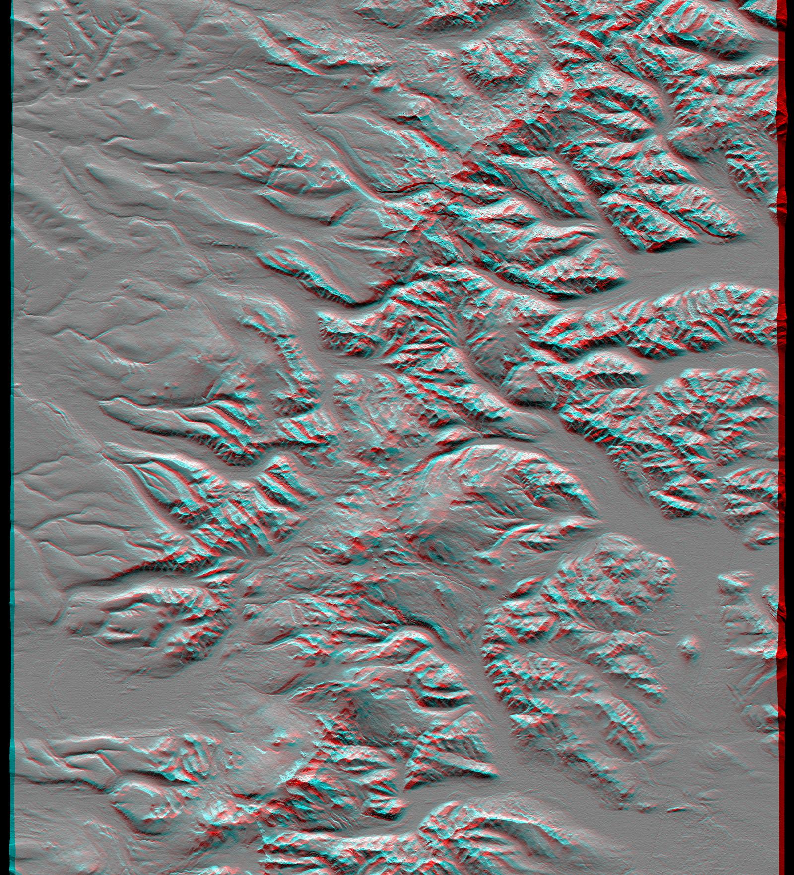 This anaglyph was produced by first shading a preliminary SRTM elevation model. The stereoscopic effect was then created by generating two differing perspectives, one for each eye. When viewed through special glasses, the result is a vertically exaggerated view of Earth's surface in its full three dimensions. Anaglyph glasses cover the left eye with a red filter and cover the right eye with a blue filter.