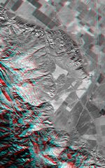 This anaglyph was generated by first draping a Landsat satellite image over a preliminary topographic map from the Shuttle Radar Topography Mission (SRTM), then generating two differing perspectives, one for each eye. When viewed through special glasses, the result is a vertically exaggerated view of the Earth's surface in its full three dimensions. Anaglyph glasses cover the left eye with a red filter and cover the right eye with a blue filter. Landsat has been providing visible and infrared views of the Earth since 1972. SRTM elevation data matches the 30 meter resolution of most Landsat images and will substantially help in analyses of the large and growing Landsat image archive.