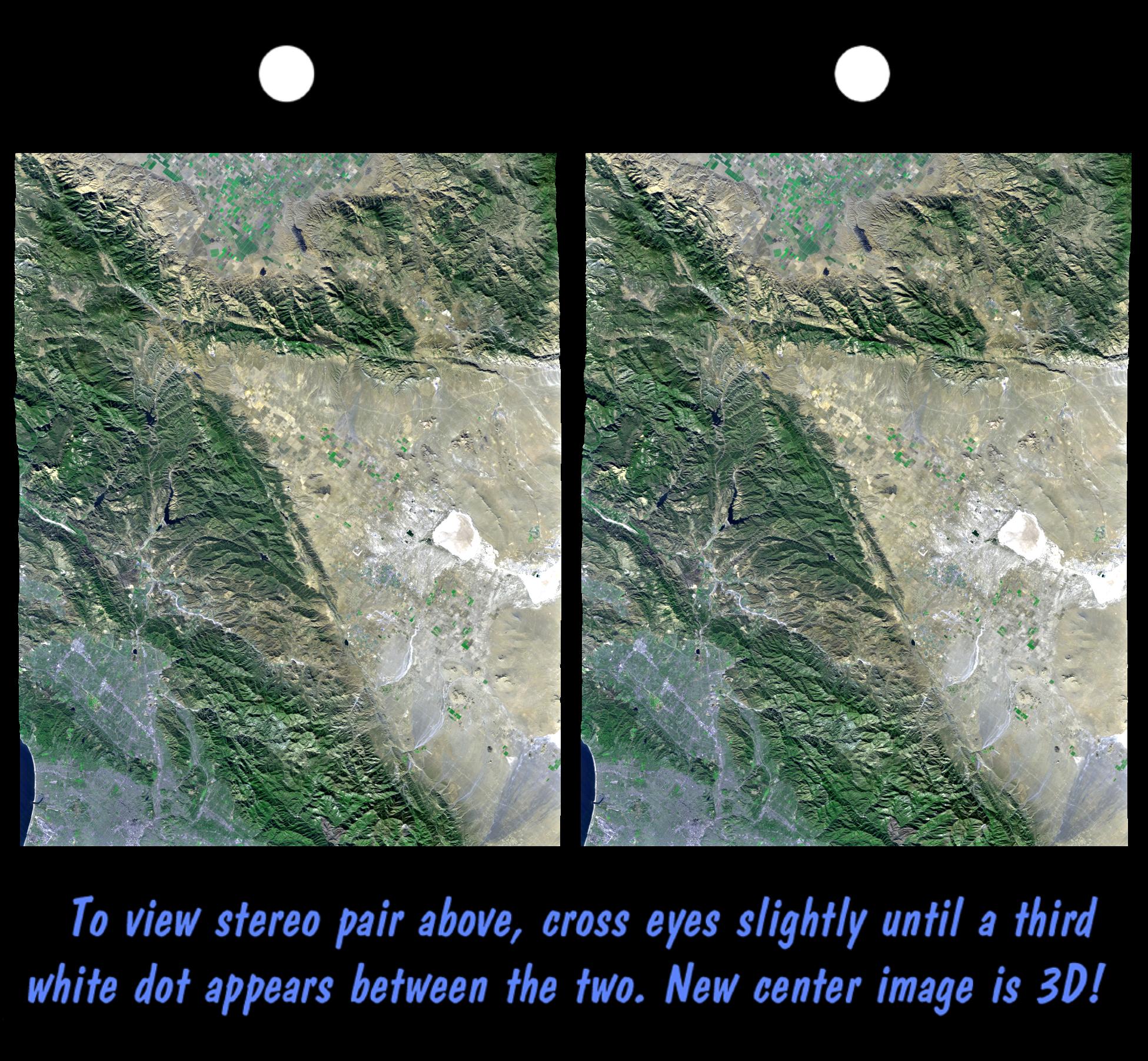 This stereoscopic image was generated by draping a Landsat satellite image over a preliminary SRTM elevation model. Two differing perspectives were then calculated, one for each eye. They can be seen in 3-D by viewing the left image with the right eye and the right image with the left eye (cross-eyed viewing), or by downloading and printing the image pair, and viewing them with a stereoscope. When stereoscopically merged, the result is a vertically exaggerated view of the Earth's surface in its full three dimensions. Landsat has been providing visible and infrared views of the Earth since 1972. SRTM elevation data matches the 30 meter resolution of most Landsat images and will substantially help in analyses of the large and growing Landsat image archive.