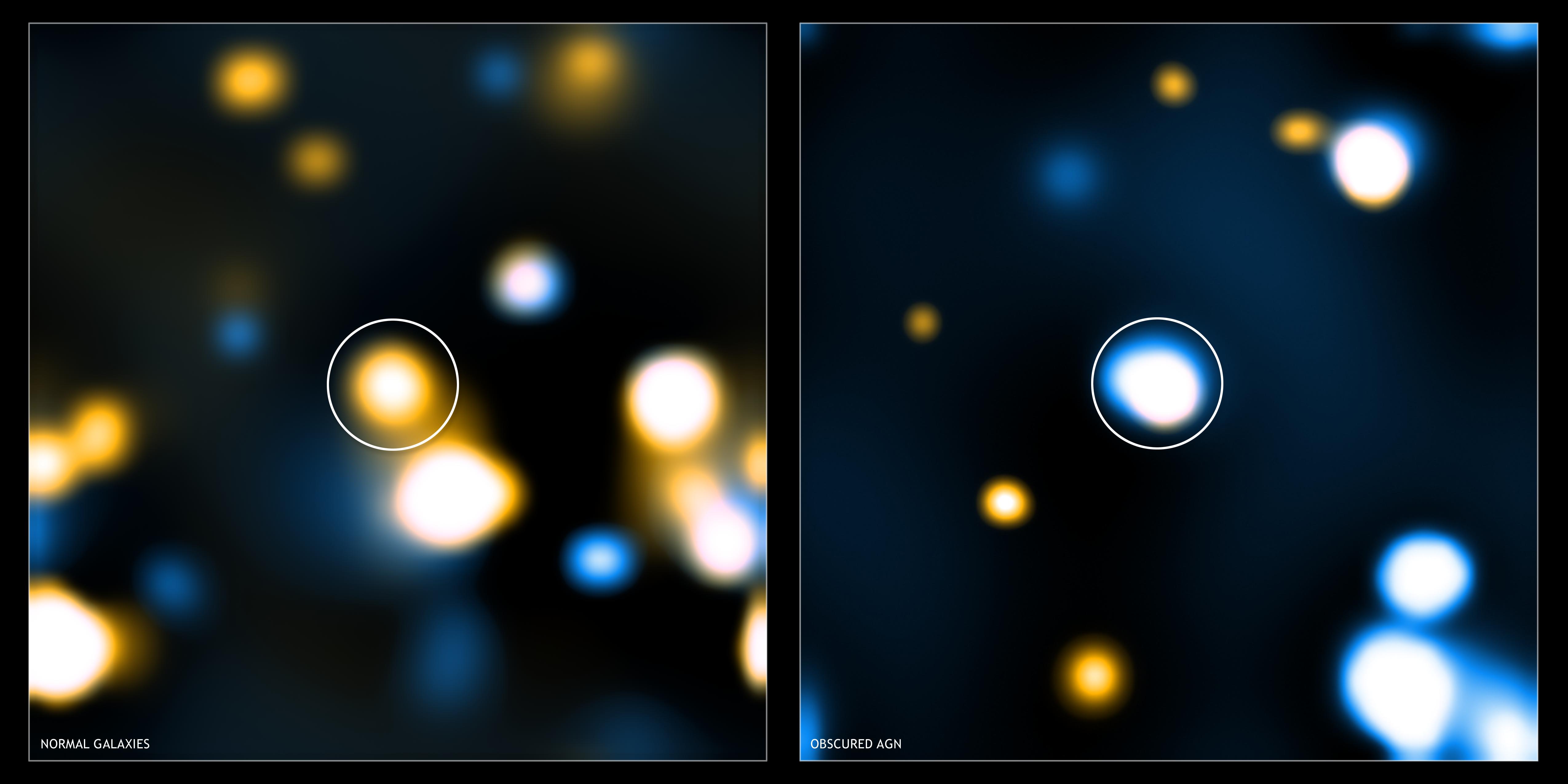 In both images, low-energy X-rays are shown in orange and high-energy X-rays in blue, and the stacked object is in the center of the image (the other sources beyond the center of the image are X-ray sources that were directly detected and are not part of the source stacking). On the left is a stacked Chandra image of the "normal" galaxies seen with Spitzer. The infrared emission for these young, massive galaxies is consistent with expectations for star formation. The Chandra image shows mainly low-energy X-ray emission at the center as expected. On the right, is a stacked Chandra image for galaxies with infrared emission exceeding the levels likely to be caused by star formation. These galaxies contain active galactic nuclei, or quasars, in their centers. These are luminous objects powered by the rapid growth of supermassive black holes. The obscured quasars show much higher levels of high-energy X-ray emission because the less energetic X-rays are mostly absorbed by gas.