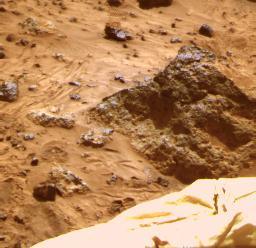 This image shows a "raw," standard-resolution color frame of the rock. PIA00818 and PIA00819 were produced by combining the "Super pan" frames from the IMP camera. The composite color frame consists of 7 frames from the right eye, taken with different color filters that were enlarged by 500% and then co-added using Adobe Photoshop to produce, in effect, a super-resolution panchromatic frame that is sharper than an individual frame would be.