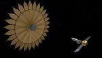 This artist's rendering shows the proposed starshade flying in sync with a space telescope. The giant sunflower-like structure would be used to acquire images of Earth-like rocky planets around nearby stars.
