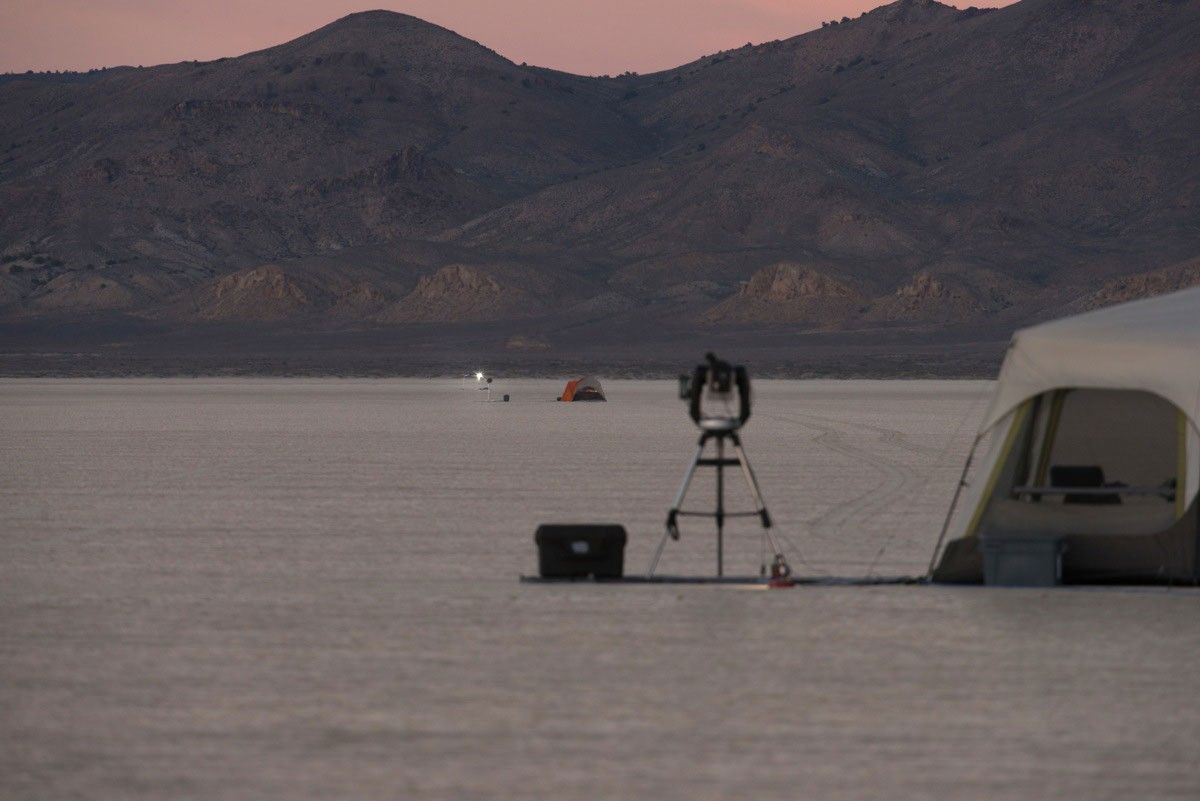 A test of a small-scale starshade model in a dry lake bed in central Nevada's Smith Creek by Northrup Grumman in May-June 2014. A telescope points toward a bright light, which mimics the conditions of starlight in space.