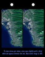 Honolulu, on the island of Oahu, is a large and growing urban area. This stereoscopic image pair, combining a Landsat image with topography measured by the Shuttle Radar Topography Mission (SRTM), shows how topography controls the urban pattern. This color image can be viewed in 3-D by viewing the left image with the right eye and the right image with the left eye (cross-eyed viewing), or by downloading and printing the image pair, and viewing them with a stereoscope.