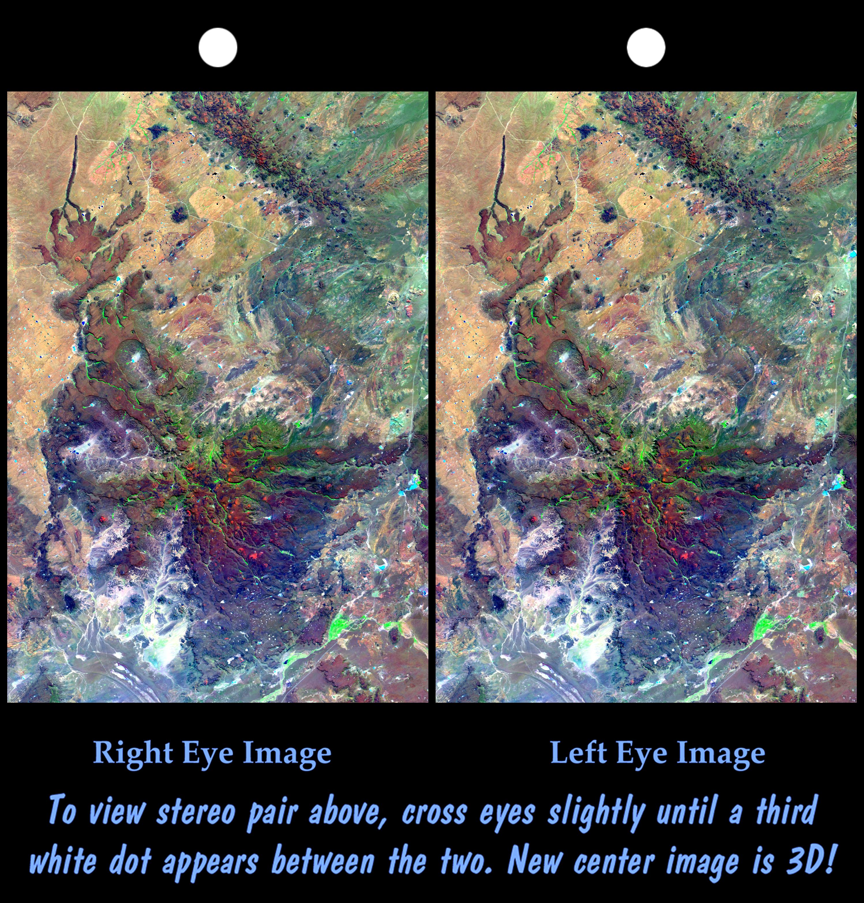 This cross-eyed stereoscopic image pair was generated using topographic data from the Shuttle Radar Topography Mission, combined with an enhanced Landsat 7satellite color image. The topography data are used to create two differing perspectives of a single image, one perspective for each eye. In doing so, each point in the image is shifted slightly, depending on its elevation. When stereoscopically merged, the result is a vertically exaggerated view of the Earth's surface in its full three dimensions.