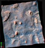 NASA's Curiosity Mars rover and tracks from its driving are visible in this view combining information from three observations by the High Resolution Imaging Science Experiment (HiRISE) camera on NASA's Mars Reconnaissance Orbiter. The image appears three-dimensional when viewed through red-blue glasses with the red lens on the left.
