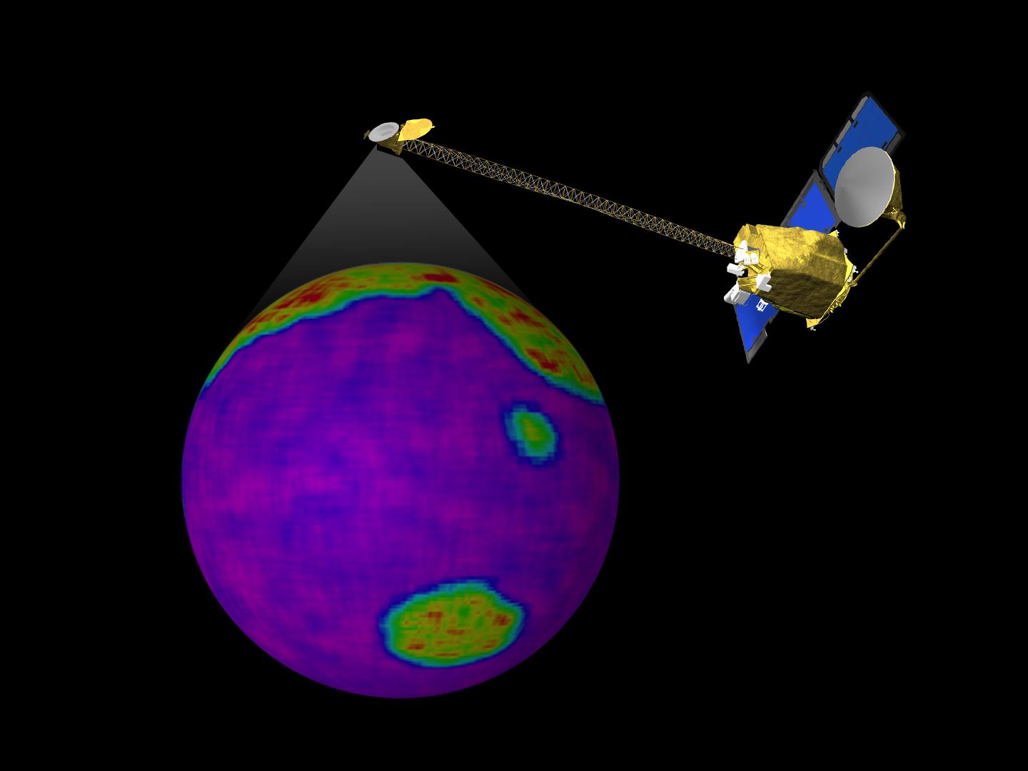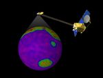 This image is a single frame from a computer animation, which begins with a global view of the planet Mars created from Mars Global Surveyor, Mars Orbiter Camera, wide angle images. In the animation the ODYSSEY spacecraft is displayed above a series of globes, where color is used to emphasize the Martian topographic, andesite, and basalt compositional differences. A global view of Earth introduces a comparison of the difference in resolution between the current MGS TES and planned ODYSSEY THEMIS observations.