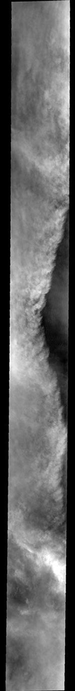 Note: this THEMIS visual image has not been radiometrically nor geometrically calibrated for this preliminary release. An empirical correction has been performed to remove instrumental effects. A linear shift has been applied in the cross-track and down-track direction to approximate spacecraft and planetary motion. Fully calibrated and geometrically projected images will be released through the Planetary Data System in accordance with Project policies at a later time.