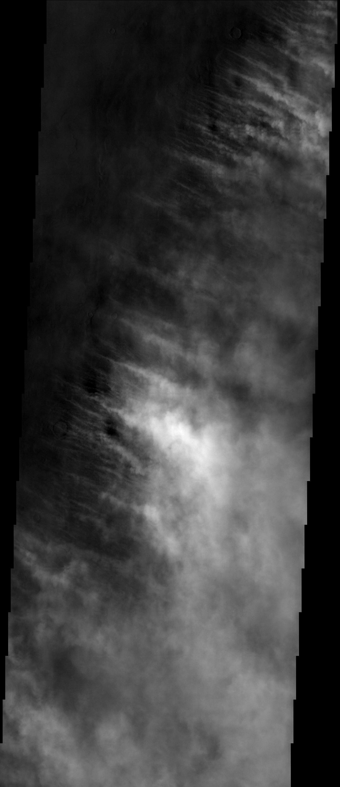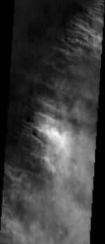 Note: this THEMIS visual image has not been radiometrically nor geometrically calibrated for this preliminary release. An empirical correction has been performed to remove instrumental effects. A linear shift has been applied in the cross-track and down-track direction to approximate spacecraft and planetary motion. Fully calibrated and geometrically projected images will be released through the Planetary Data System in accordance with Project policies at a later time.