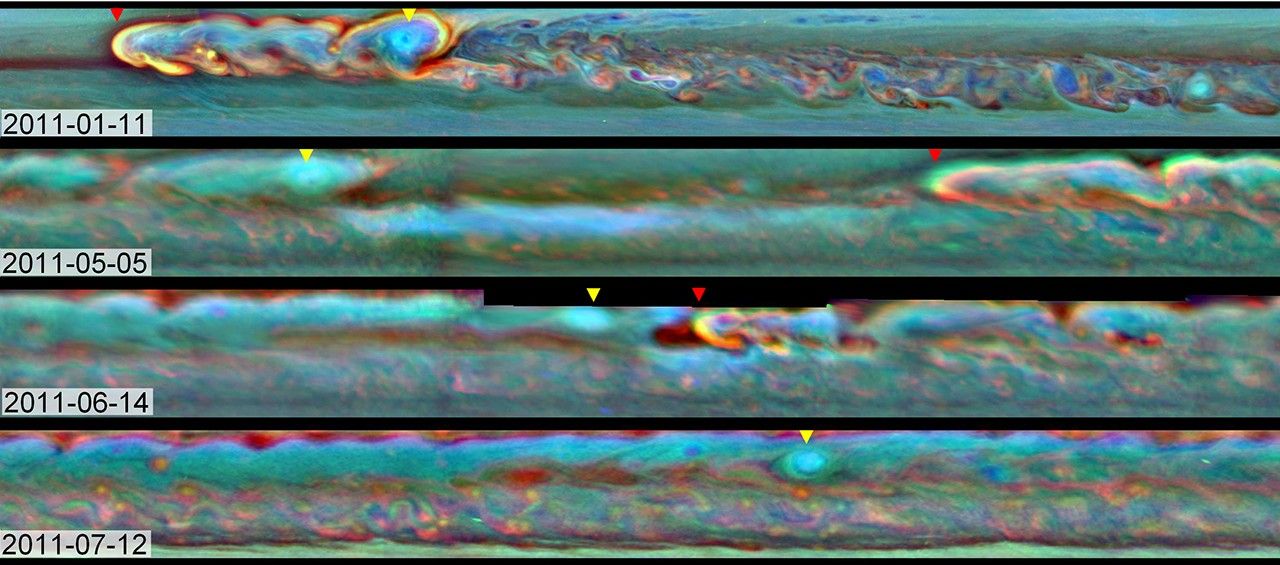 The top image was taken on Jan. 22, 2011, shortly after the start of the storm, showing the bright head of the storm just ahead of the vortex by about 25,000 miles (40,000 kilometers). The second image shows that, on May 5, 2011, the head of the storm has traveled around the planet and started approaching the vortex from the east. The storm's body stretched 140,000 miles (224,000 kilometers), and the head was within about 51,000 miles (82,000 kilometers) of catching up to the vortex. This image also shows how quickly the vortex lost steam, shrinking and losing its bright clouds, compared to the still-raging head of the storm. By the third image, taken on June 14, 2011, the head of the storm had made its way almost entirely around the planet, about 183,000 (292,000 kilometers) miles ahead of the vortex in a westward direction, and it was about to catch up with the vortex. The head of the storm was just 8,700 miles (14,000 kilometers) to the east of the vortex at this time. The bottom image, from July 12, 2011, shows how the storm fizzled once the head and vortex collided. Only the vortex remains in that picture, while the bright cloud has disappeared. By late August, that band around Saturn stopped thundering and throwing lightning for good, though there continues to be turbulence in higher parts of the atmosphere.