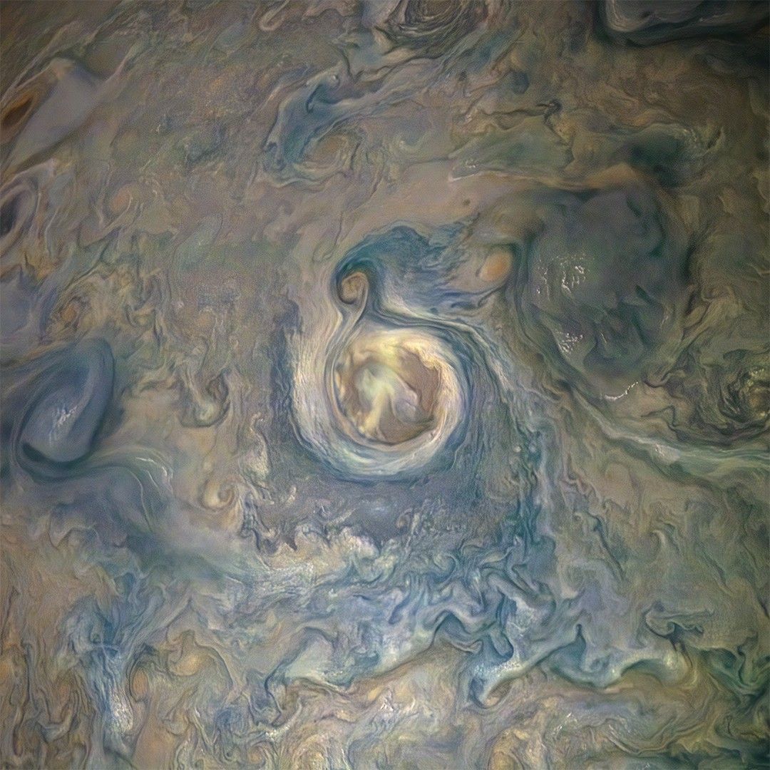 It is not unusual for our contributors to build on each others work — the raw JunoCam image was first processed by Gerald Eichstädt. Sean Dorán enhanced the color and zoomed in on the most beautiful storm in the image. The contributor known as MEO_23 in turn exaggerated the color in Dorán's version (contributors can decide whether to use their own names or a system-provided name).