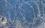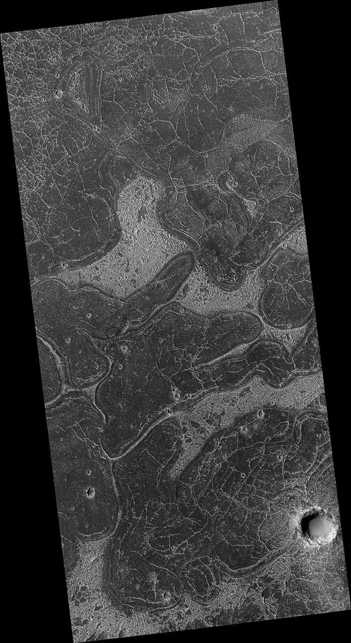 This region of Echus Chasma has been flooded by lava flows that produced rough and smooth surfaces. The rough areas then trap bright dust, creating the contrasts in brightness.