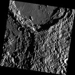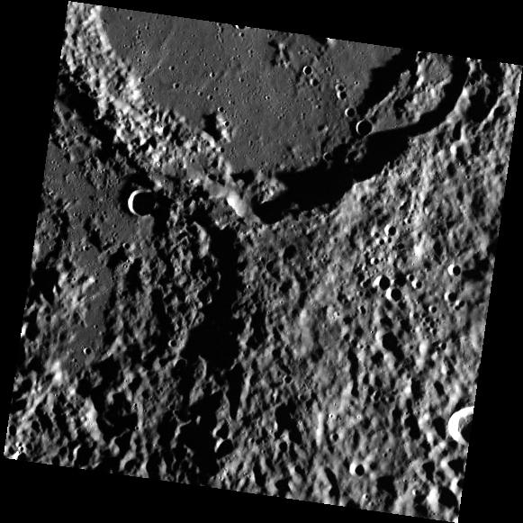 This image is of the southern rim of the crater Stravinsky. In this high-incidence-angle lighting, the topography of the crater is easily seen. Particularly noticeable is the difference between the crater's flat floor and the hummocky terrain of the ejecta blanket outside the crater. The area in the lower left of the image is part of the Vyasa basin. Since Stravinsky's ejecta overlaps Vyasa, we can deduce that Stravinsky is younger than Vyasa.
